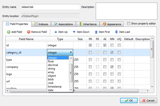 Field | name, type, size, required, unique, primary key, auto increment, default value, enum values, description |