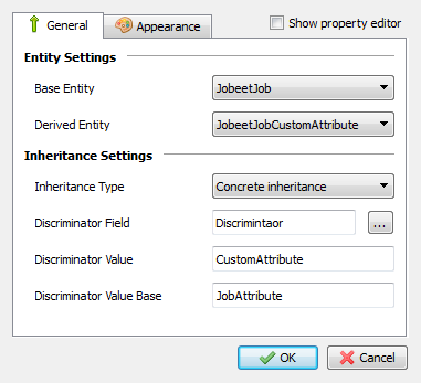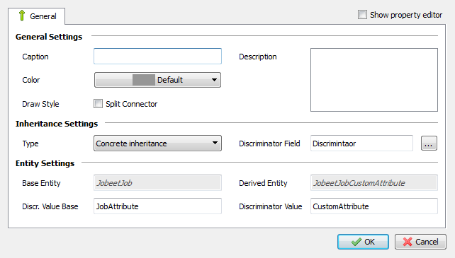 Inheritance | base/derived entity, inheritance type, discriminator value/field, description |
